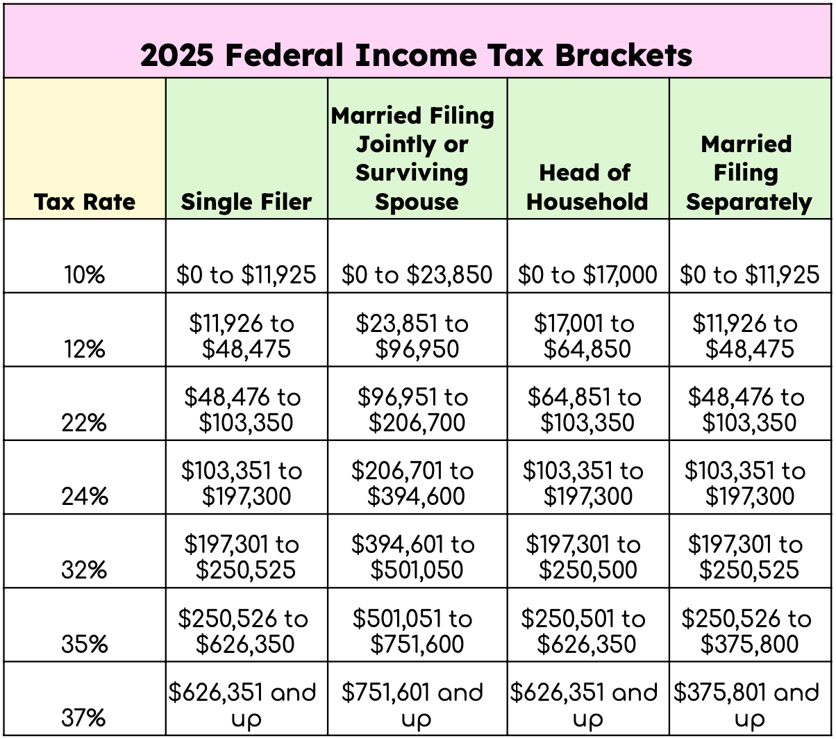 Below is a table of the 2025 federal income tax brackets: